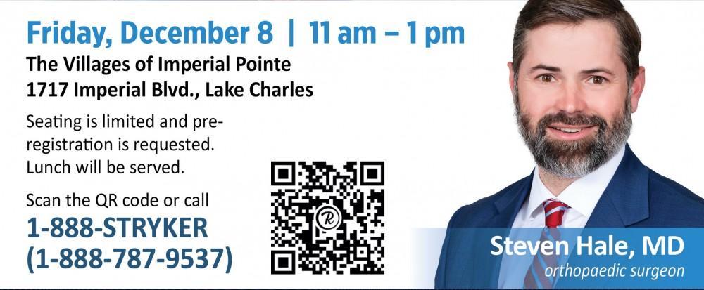 Steven Hale MD, an orthopedic surgeon with the Center for Orthopaedics and medical director of the Joint Replacement Center of Louisiana, will be the guest speaker at a joint pain seminar on Friday, December 8, at The Villages of Imperial Pointe in Lake Charles. The seminar will begin at 11 am and lunch will be served.